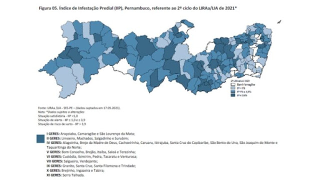 Outros mais de 40 se encontram em situação de alerta, segundo dados da Secretaria Estadual de Saúde (SES-PE), de acordo com o Índice de Infestação Predial do 2º ciclo do LIRAa (Levantamento de Índice Rápido do Aedes aegypti).
