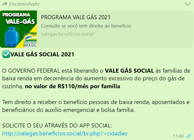 Novo golpe no WhatsApp que promete um vale-gás social no valor de R$ 110 reais para as famílias de baixa renda em decorrência do aumento excessivo do preço do gás.*O link que está sendo enviado para as contas do whatsapp começou a circular no começo do mês passado.
