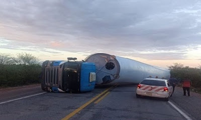 Duas pessoas morreram na tarde de quarta-feira (9), em um acidente registrado no km 163 da BR-428, nas proximidades da Serra da Santa, zona rural de Petrolina (PE). De acordo com a Polícia Rodoviária Federal (PRF), um caminhão que transportava um tubo de pá eólica tombou e atingiu duas caminhonetes.