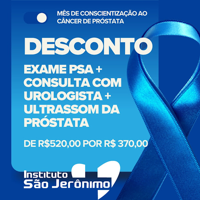 No dia 29 de novembro o Instituto São Jerônimo está com um desconto imperdível para você homem cuidar da sua saúde! Exame PSA + consulta com urologista + ultrassom da próstata de R$520,00 por apenas R$370,00.